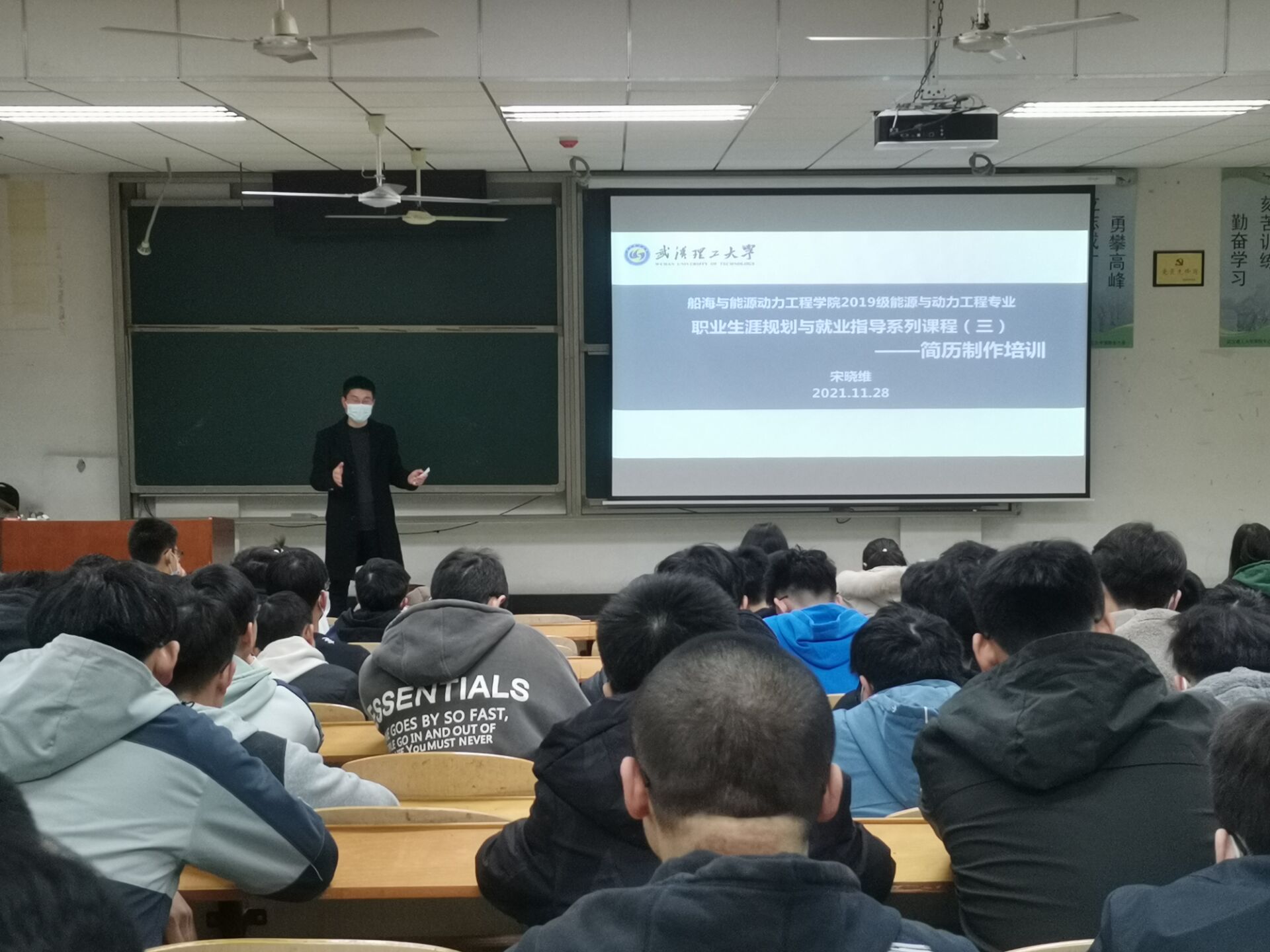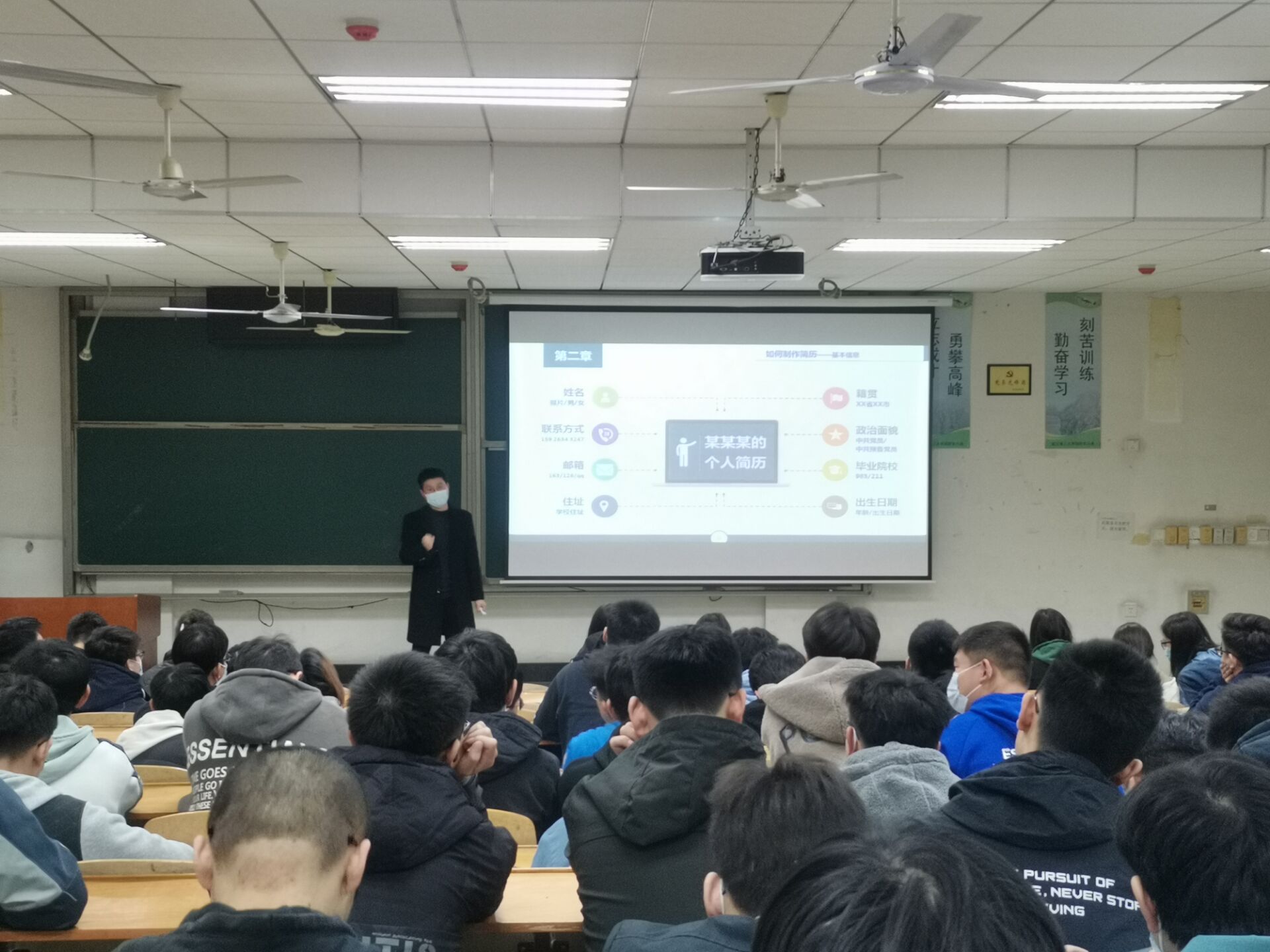 为进一步提高年级学生求职技巧,提升年级学生职业素养,11月27日晚和12月5日晚,H动画 2019级能源与动力工程专业利用年级周课主阵地,在航海楼315教室开展职业生涯规划与就业指导(第三讲)——学会制作简历。本次培训由辅导员宋晓维老师主讲,2019级能源与动力工程专业全体同学都参与了此次培训。