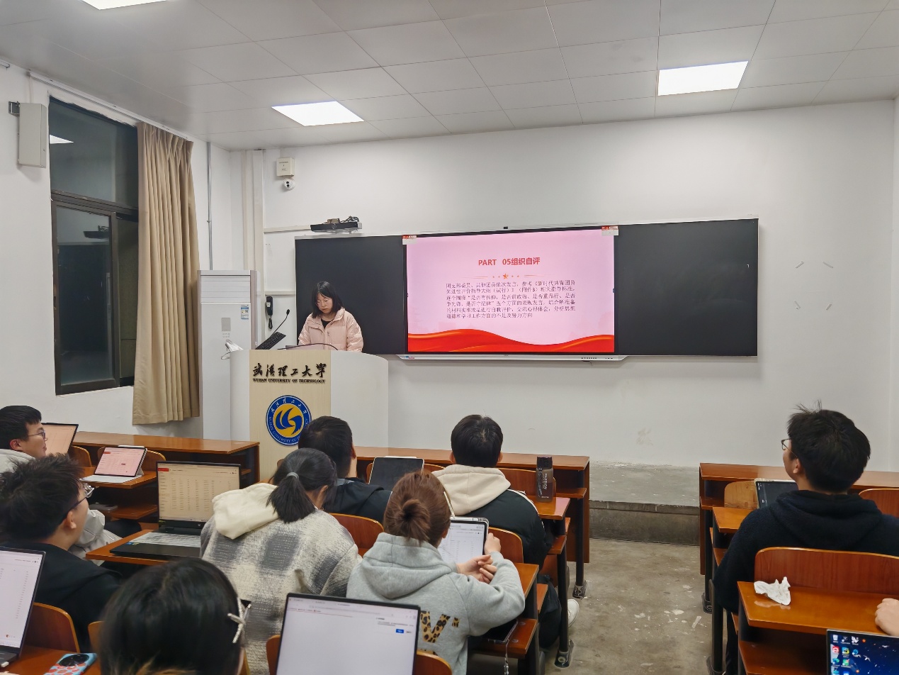 在尹璐的组织下,团员们分组开展互评交流。大家进入评议系统,从思想政治、道德品行、学习工作、作用发挥等方面进行自我剖析,。有的同学反思了自己参与支部活动不够积极的问题,有的同学提出在专业学习上存在畏难情绪。最后,尹璐作总结发言。她肯定了团员们敢于正视问题、勇于修正错误的决心,并强调要将查摆出的问题清单化、整改措施具体化,切实推动组织生活会成果转化为成长动力。她勉励全体团员以此次组织生活会为新起点,不断增强先进性和光荣感,在班级建设、专业学习和社会实践中发挥模范带头作用,以实际行动践行青春誓言。